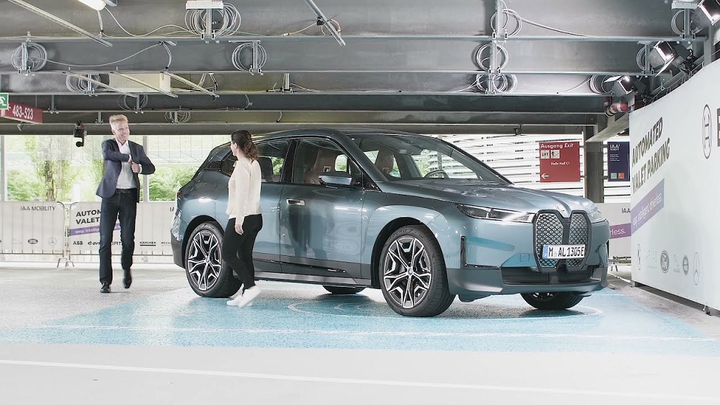 A legújabb iX egy teljesen gyári automata parkoló rendszerrel van szerelve, ez a rendszer közösen, a parkoló teljes területére telepített érzékelők tömegével összedolgozik így irányítva a SUV közlekedését. A rendszer önállóan keres egy szabad parkoló helyet, majd egy robotkar kinyúlik és a töltőfejet csatlakoztatja, ezzel megkezdi az autó akkumulátorának töltését. A videóban látható, hogy az iX le is mosatja önmagát egy automata autómosóban amely a parkolóházon belül van, de nem azt jelenti, hogy a BMW mindig az autómosón keresztül közlekedik, ez csak egy kényelmi funkciója a rendszernek, amellyel időt takaríthat meg az autó használója.
